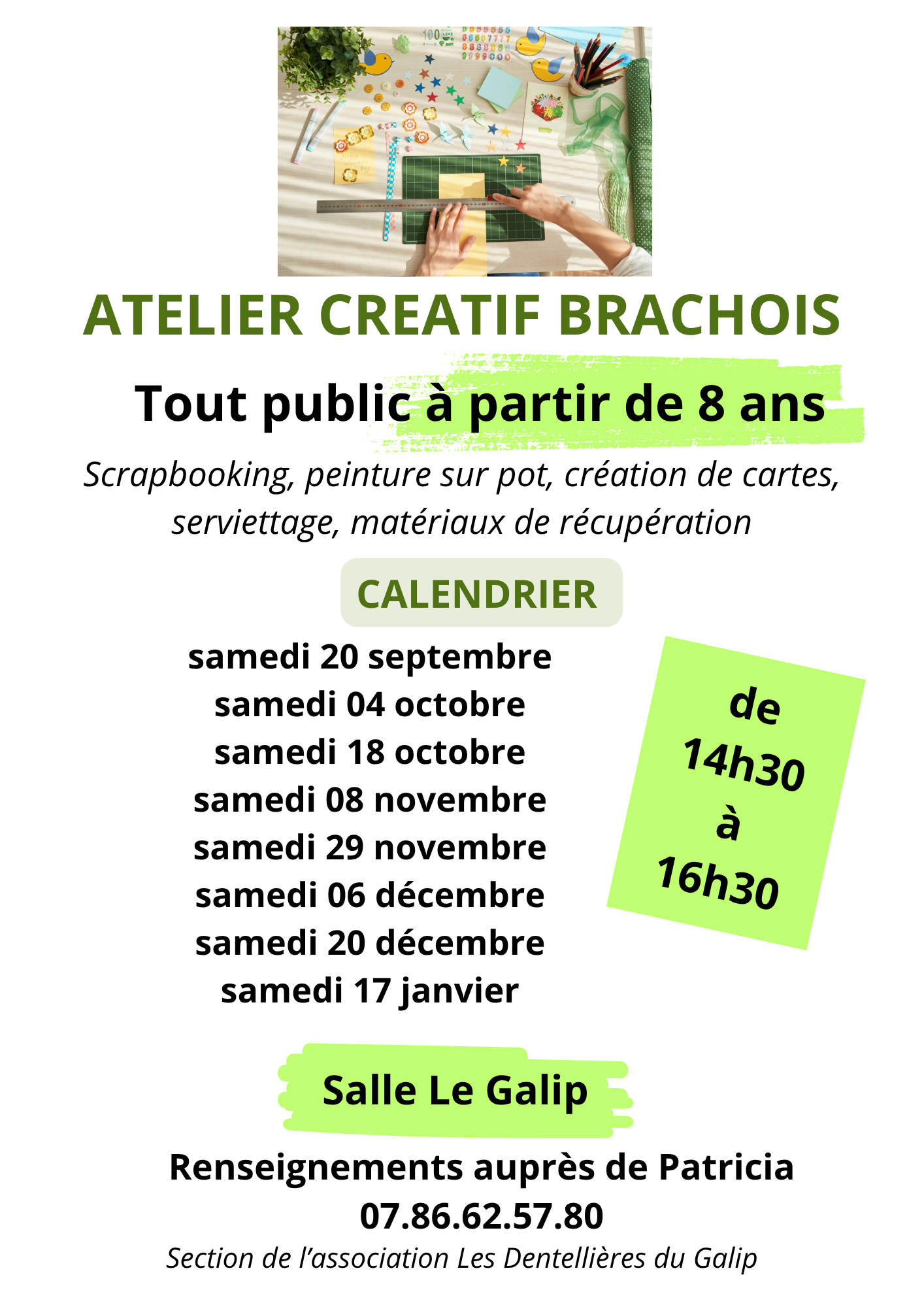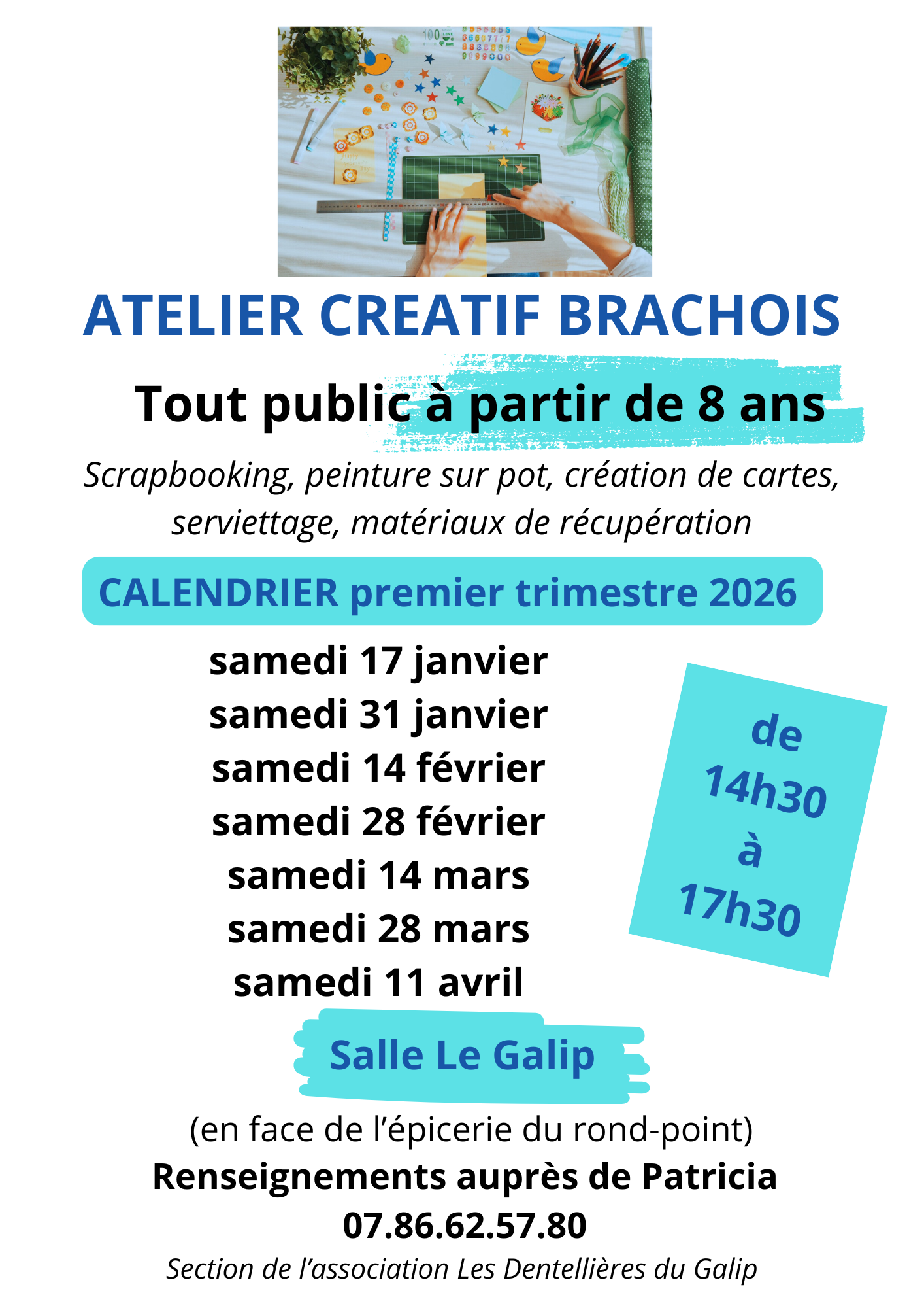 De 14h30 à 16h30, dans la salle communale du Galip, route de Carcans (face à l'épicerie du Rond-Point), Patricia vous accueille pour l'atelier créatif brachois.