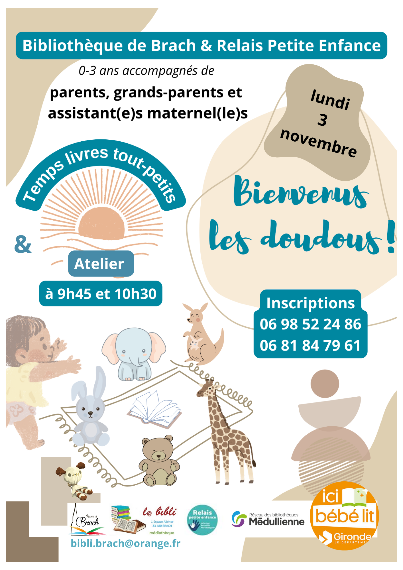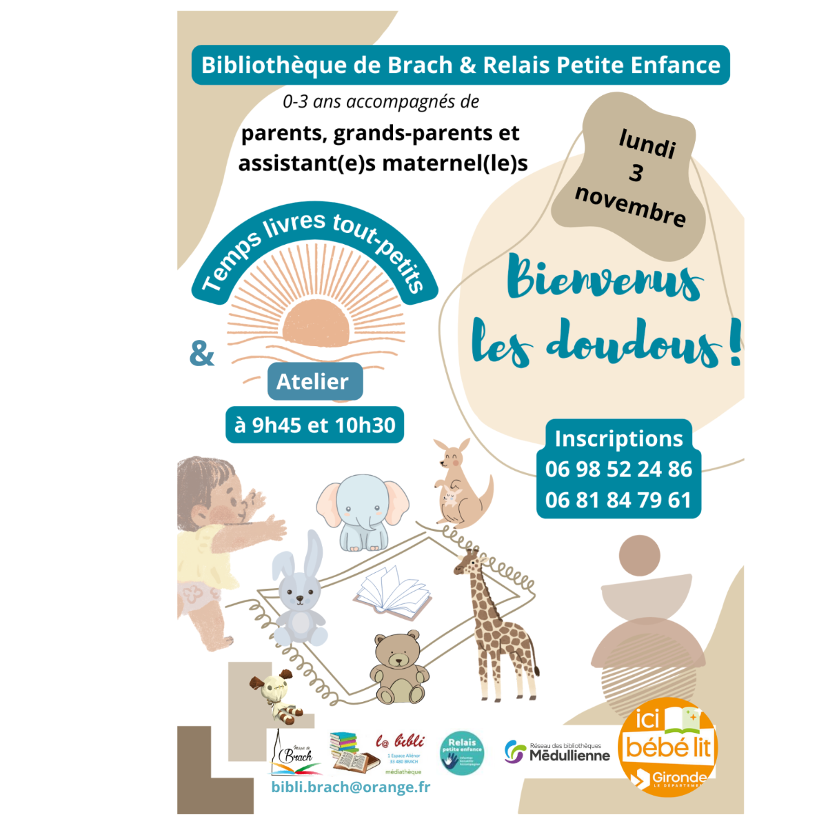 Sur inscription au 06 98 52 24 86 (RPE) ou 06 81 84 79 61 (Bibliothèque) ou par mail auprès de bibli.brach@orange.fr